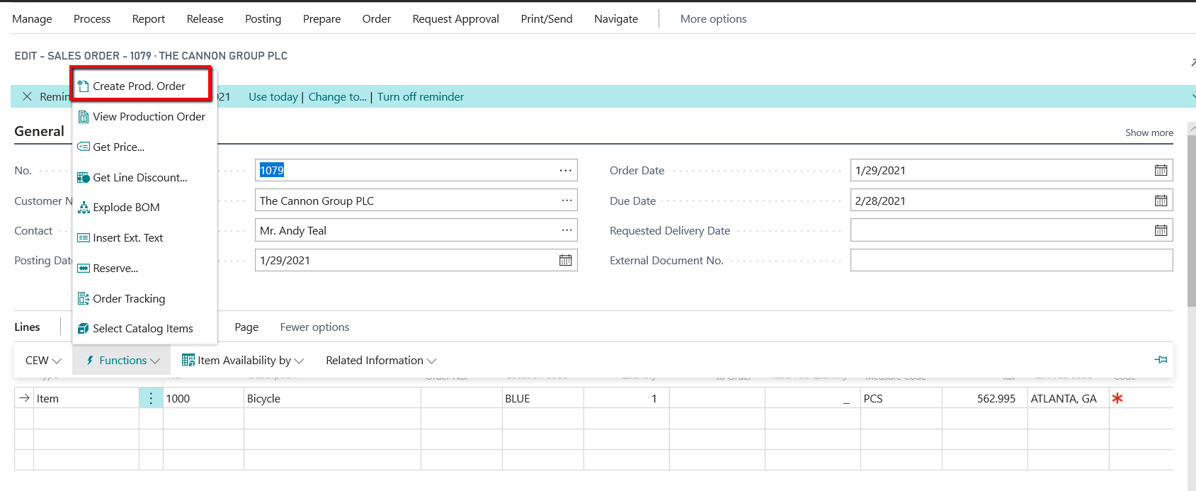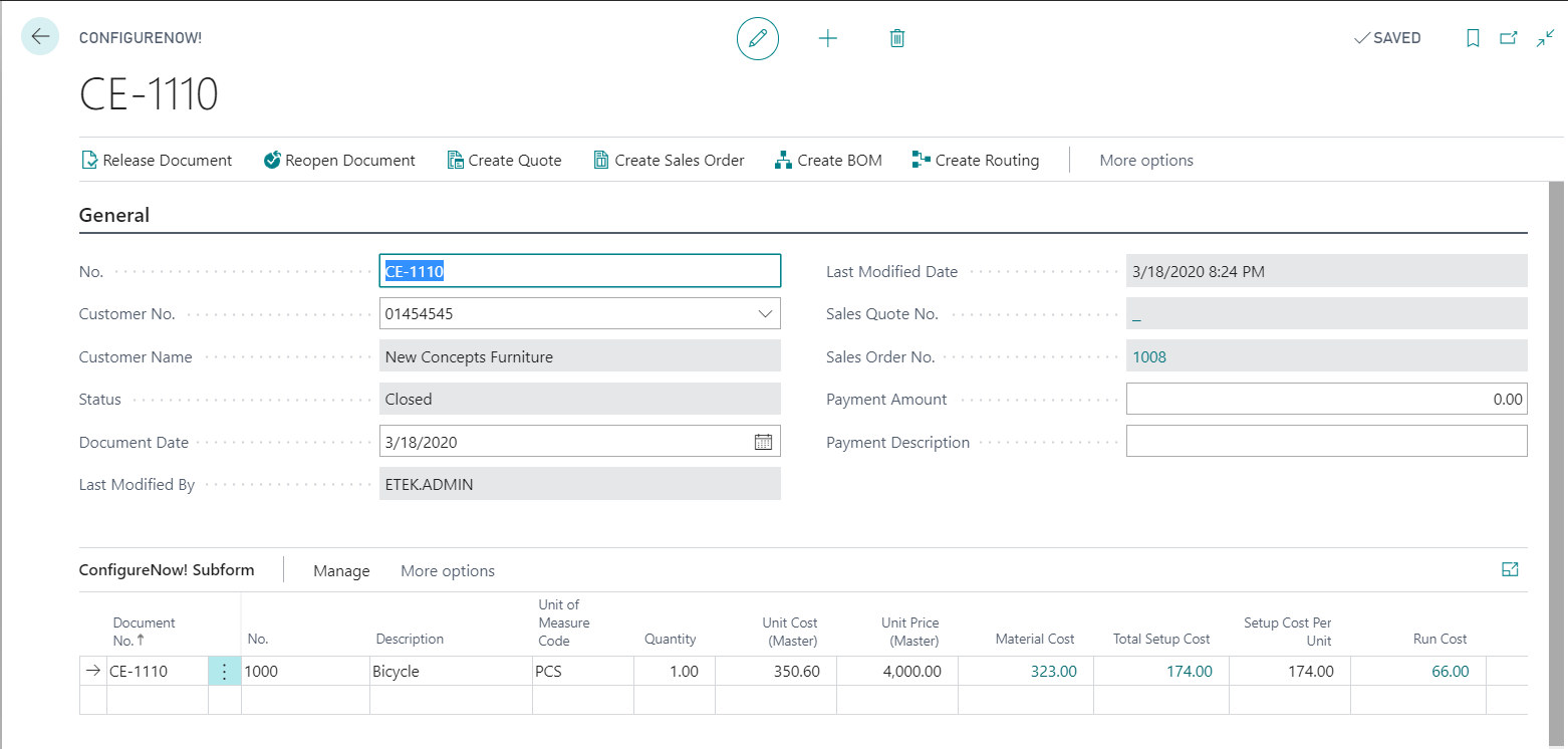 Create sales Order function will create the sales Order from Configure Now! Card. Sales Order line will be copied from the Configure Now! Line.