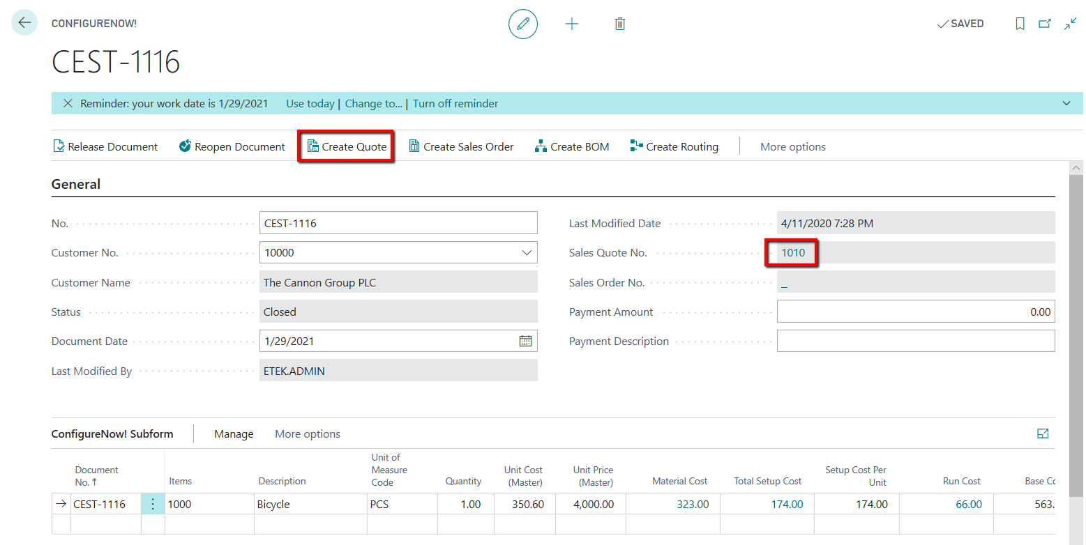 Create sales Quote function will create the sales quotation from Configure Now! Card. Sales Quote line will be copied from the Configure Now! Line.